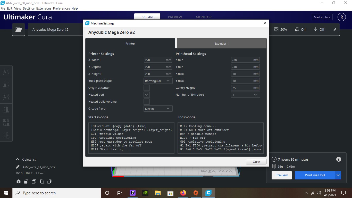 However mine was not one of the choices.. Further, under extruder 1 change the material diameter to 1.75. Then, select anycubic > anycubic i3 mega.we'll use this as the base for the anycubic mega x since it's similar and then modify the profile from there. Here is what we suggest as the best cura anycubic i3 mega cura profile. Hi i'm a new mega zero 2.0 user and i was looking in cura to set up the new printer but when i chose the any cubic tab all it had was the mega zero and not the 2.0 and i just wanted to know if the mega zero profile works with the 2.0 printer. Anycubic mega zero 2.0 pla profile tweeked profile import pla profile.curaprofile into your profiles in cura settings import materials.xml.fdm_material into you material settings click activate on each to set as actives. After writing it in, click once in another box (just click on 0.4).